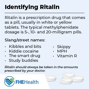 Ritalin is a prescription drug that comes as a pill, usually in white or yellow tablets. The typical methylphenidate dosage for these tablets is 5-, 10- and 20-milligram pills.