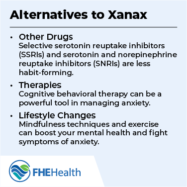 Xanax and benzodiazepine drugs are not the only choice of anti-anxiety medication. When treating your anxiety symptoms, doctors may start you on benzodiazepines because they are fast-acting and produce an immediate improvement. Before you can develop a tolerance for Xanax, they may swap you to something less habit-forming. Some of the most popular choices are selective serotonin reuptake inhibitors (SSRIs) and serotonin and norepinephrine reuptake inhibitors (SNRIs).
