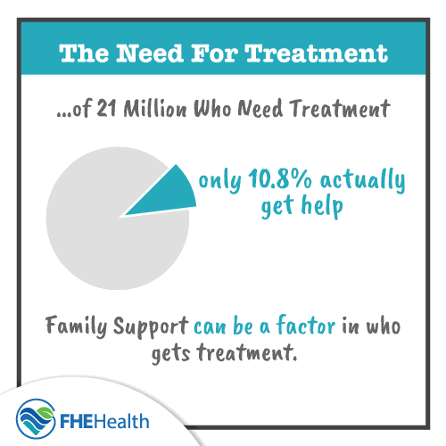 When it comes to successful recovery, having a support system of individuals committed to your long-term sobriety can make a big difference. Getting your family involved in your recovery can help you at any stage of recovery. Family members can help you focus on recovery during rehab and can offer a safe, supportive base that helps you stick to your recovery plan once your rehab program is complete. Only about 10.8 percent of the more than 21 million Americans over age 12 who need substance abuse treatment actually get help, and family support can be a factor in who gets treatment and who completes their treatment plan successfully.