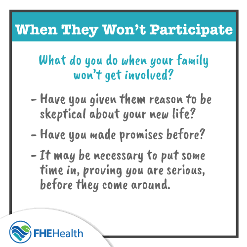 Some family members may need to see that you’re serious about recovery before they’re willing to participate in group family therapy or offer support. This is especially true if you have promised to seek help before and failed to follow through. Describing the steps you have taken so far to get help and what steps you have planned for the next few days, weeks and months may help alleviate the fears of family members and help get them on board with your recovery plan.