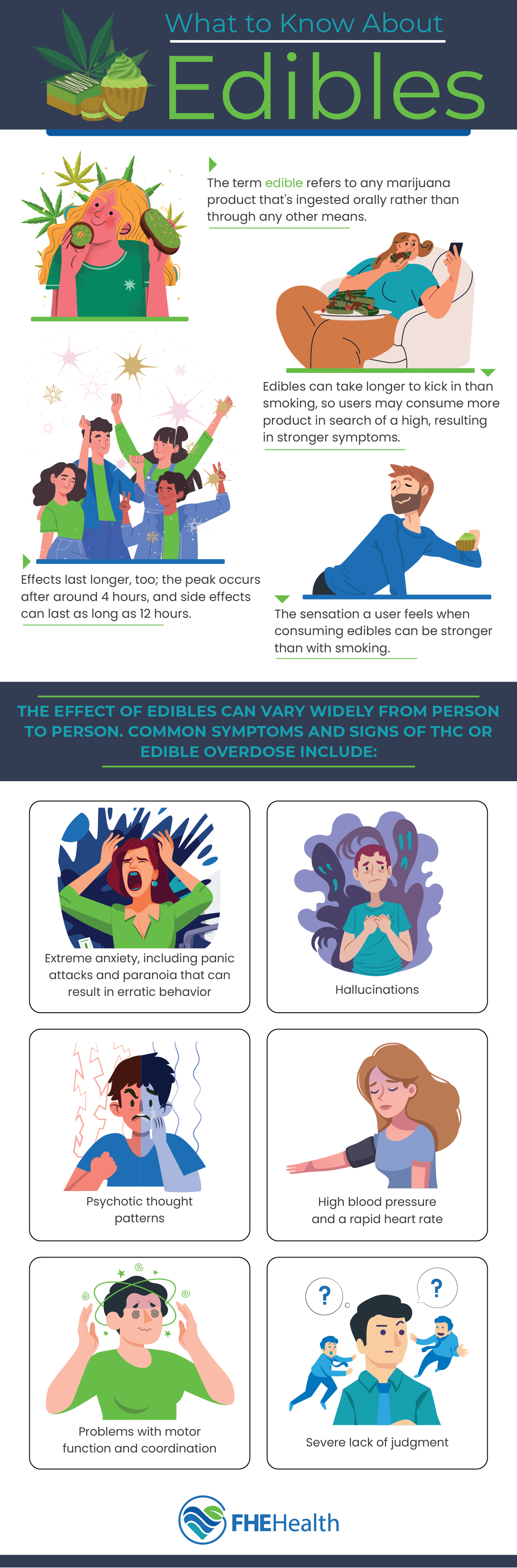 Those not used to eating marijuana may be surprised at the contrasts between smoking and edibles. If you’re expecting the same effects as smoking, it’s not uncommon to become overwhelmed by the sensation. Edibles can take longer to kick in than smoking, so users may consume more products in search of a high, resulting in stronger symptoms. For those not prepared for the difference in sensation, panic or paranoia can result.