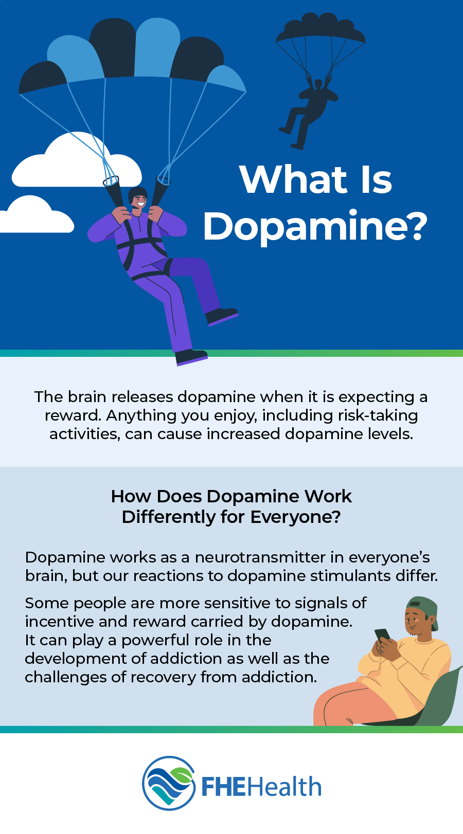 Known as the “feel-good” hormone, dopamine is a chemical messenger that relays signals between brain cells. This definition doesn’t readily explain the intense feelings of pleasure that the chemical can trigger and, yet, dopamine is much more complex than at first glance. The brain releases dopamine when it is expecting a reward. Anything you enjoy, including those risk-taking activities, can cause increased dopamine levels.