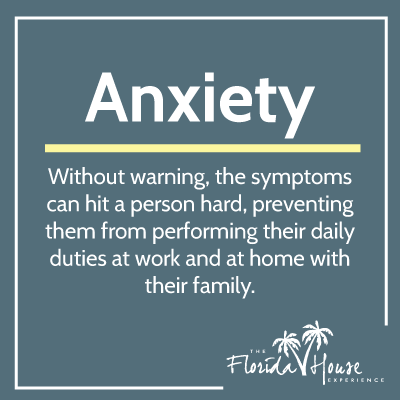 Anxiety is a mental health disorder characterized by feelings of worry or panic. That is anxiety at the most basic level. This can be characterized by panic attacks, and symptoms include stress that’s out of proportion to the impact of the event, an inability to set aside a worry, and restlessness. However, it is not as simple as “not worrying” “going outside”, “relaxing” or “feeling better.” People who struggle with any mental illness have a chemical imbalance in the brain. Many people who struggle with mental illness may be told to just get better on their own. Well, unfortunately, it is just not that simple. The reason being, people who struggle with anxiety have a chronic condition that is not easily shaken with willpower. Thus, it is necessary for individuals who are struggling with any mental illness, but in this case anxiety, to get the help they need. Luckily, we at the Florida House Experience are ready to help you. Our team is comprised of the most experienced and well-regarded doctors and professionals in the mental health world and would love to help you with quick advice, answers to questions, or complete treatment at one of our facilities.
