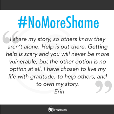 - Erin, who shared how treatment helped her address major depression and PTSD from sexual, physical, and emotional abuse, wrote:“I share my story, so others know they aren’t alone. Help is out there. Getting help is scary and you will never be more vulnerable, but the other option is no option at all. I have chosen to live my life with gratitude, to help others, and to own my story.”