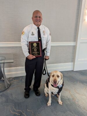Today, Oscar lives 24/7 with Dean, an active firefighter in his 23rd year of public service, and the two of them are often recognizable at events in the Broward County community. In September the pair received the “Firefighter of the Year” award from the city of Weston, Florida.