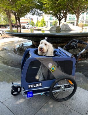 More than three years later, Kora has become an integral part of the Asheville Police Department and its efforts to build positive relationships with the community. She “paw-trols” downtown Asheville in her own specially donated paw-trol cart and participates in school and youth programs and other community events, often in one of her many colorful and flamboyant outfits.