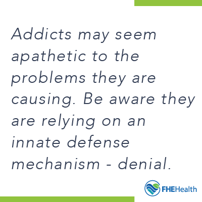 Addicts refuse to or cannot think about how their addiction is affecting others because their addiction has disrupted normal thinking patterns. Failure to acknowledge the consequences of their addiction is a way for addicts to avoid excruciating feelings of guilt and shame. Although addicts may seem apathetic to the problems they are causing you and other loved ones, be aware they are relying on an innate defense mechanism we all use occasionally–denial.