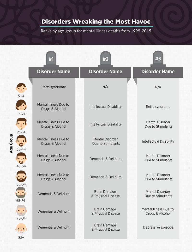 Younger and older Americans are more likely to suffer from deaths caused by other mental illnesses. Rett syndrome—a rare genetic disorder that impacts brain development—is the deadliest mental health disorder for children under 15. This disorder, which currently has no cure, is also the third most common mental illness–caused death among those aged 15 to 24. For adults aged 64 and older, dementia and delirium are the mental disorders likely to cause death.