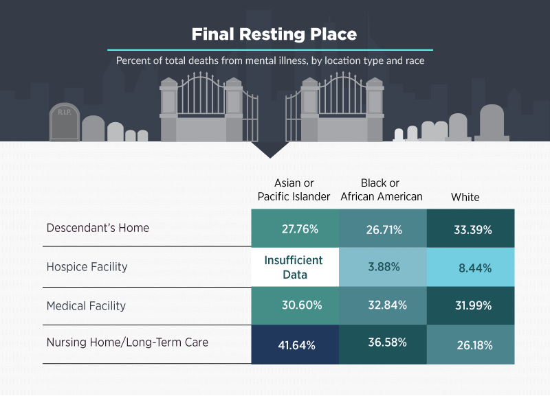 Mental illness–caused deaths in medical facilities were comparatively common across the races we looked at, around 31 percent of Asians/Pacific Islanders, 33 percent of Black/African American people, and 32 percent of White/Caucasian people passed away in these settings.