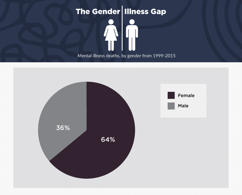 Among people who die from mental health disorders, there is a clear disparity in gender: 64 percent are women, compared with just under 36 percent who are men. Historically, women have fared worse than men when it comes to securing medical treatment. Studies have shown women are less likely to receive adequate medical treatment, and female patients are more likely to be perceived as “crying wolf”—hypochondriacs who may be lying about their pain. For dementia in particular, a UK study revealed women are less likely than men to get the proper care.
