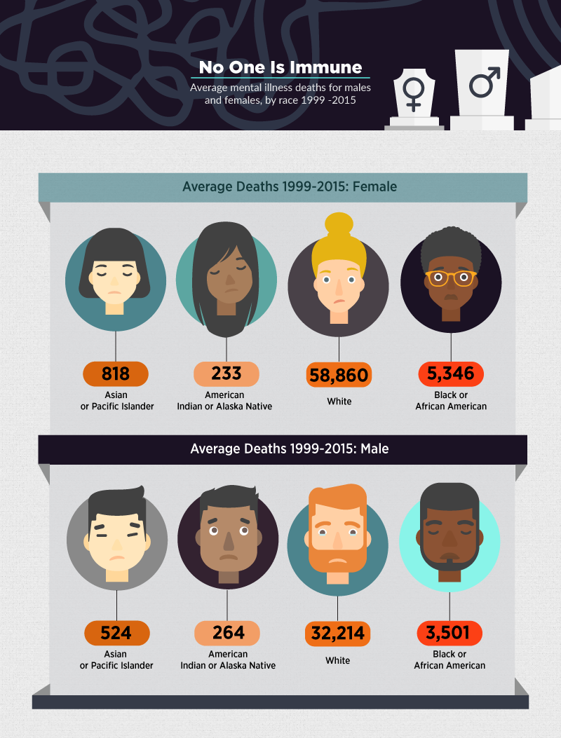 Among different races, 33 percent of those who identified as White/Caucasian succumbed to mental illness. In contrast, only 28 percent of Asian/Pacific Islanders and 27 percent of Black/African American people did the same.
